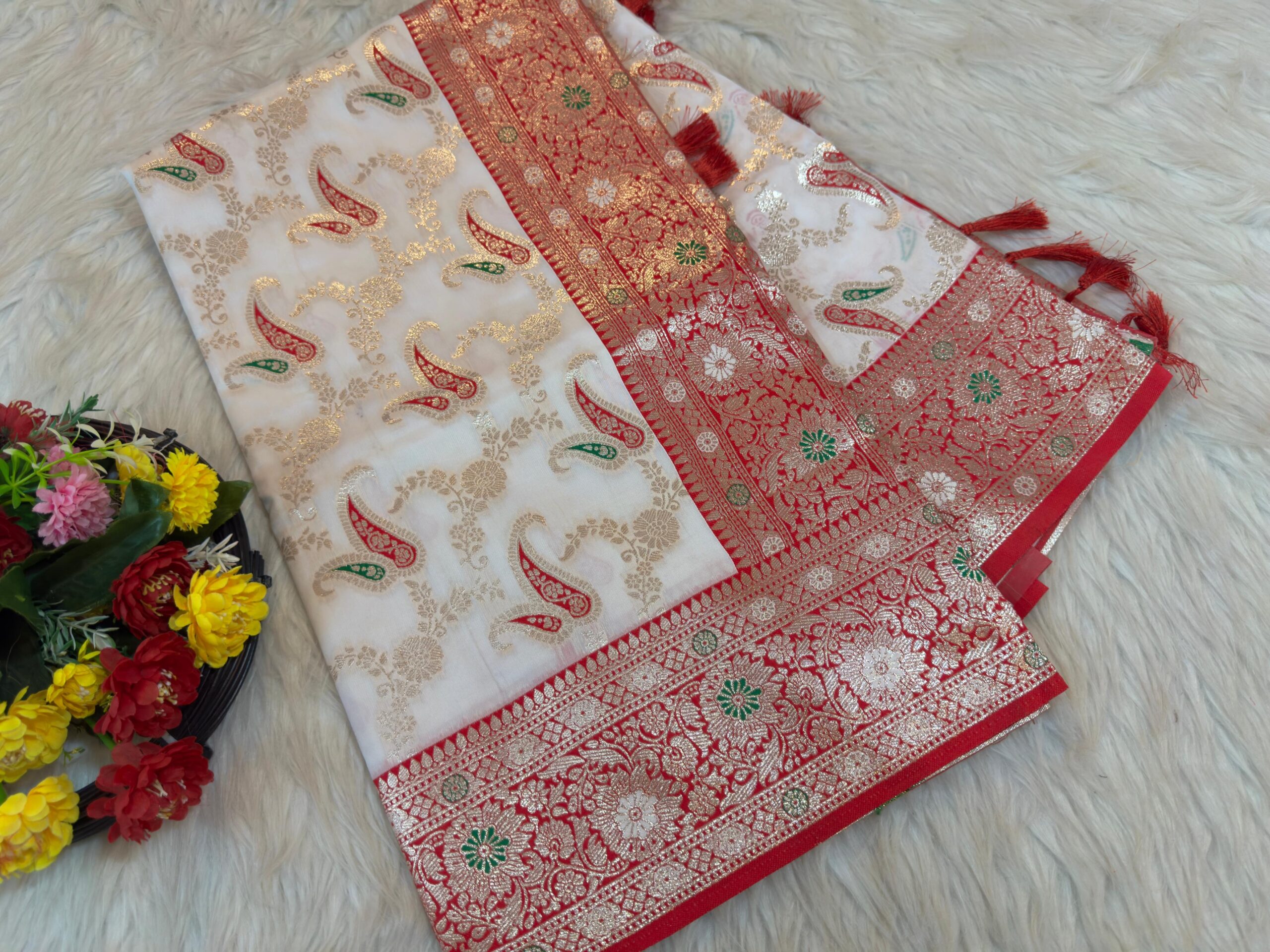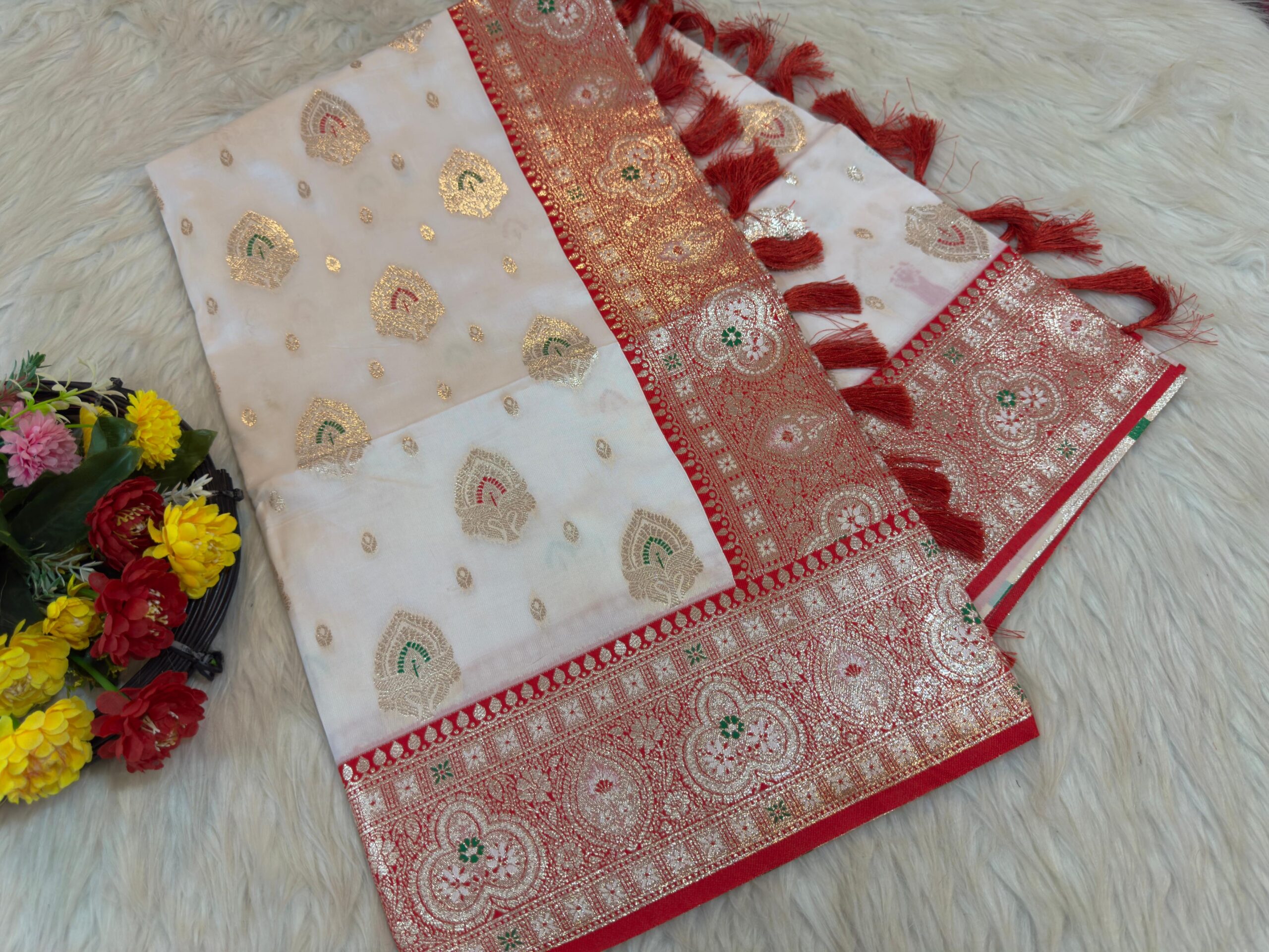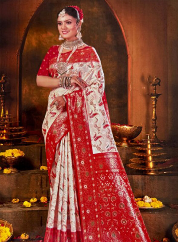 অরজিনাল ইন্ডিয়ান সাদা লাল কাতান শাড়ি